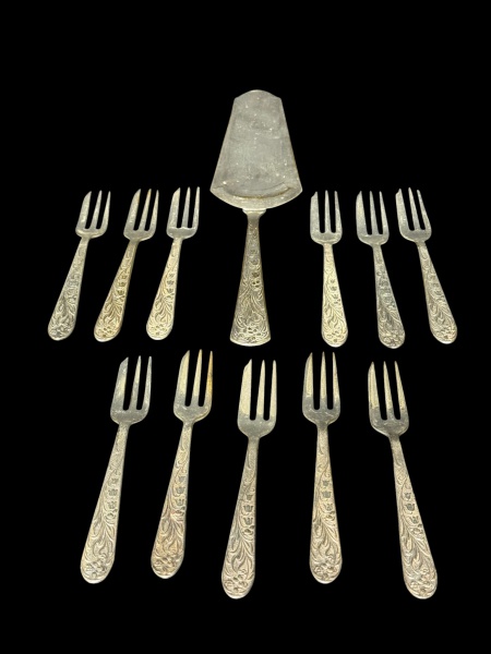 • METAL PRATEADO, doze (12) peças para bolo confeccionadas em metal espessurado a prata com cabo cinzelado por elementos florais relevados, sendo 1 pá para bolo e 11 garfos para bolo, algumas peças com falhas na prateação.
