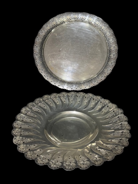 • METAL PRATEADO, lote com duas (2) peças confeccionadas em metal espessurado a prata, sendo: A) PRATA REGIA, 1 bandeja redonda com cinzelado de elementos vegetalistas em vazados e bordas recortadas, apresenta ranhuras e necessita banho, medindo 34cm e B) AUREA, 1 fruteira com cinzelado de elementos florais em vazados, gomos torcidos e bordas em ondulações, medindo 30cm.