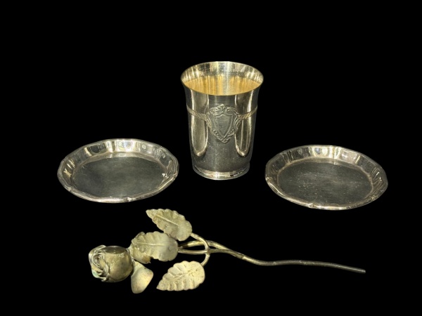 • METAL PRATEADO, quatro (4) peças confeccionadas em metal espessurado a prata de modelos, tamanhos e decorações distintas, sendo; A) 1 copo infantil cinzelado por brasão em relevo da manufatura ART PRATA, medindo 7x5,5cm, B) 2 porta copos com bordas recortadas, medindo 8,5cm e C) 1 flor com folhagens relevadas, medindo 16,5cm.