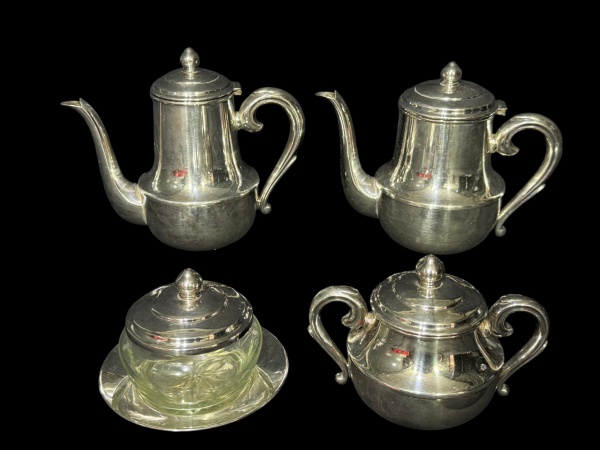 • METAL PRATEADO, serviço para chá/café confeccionado em metal espessurado a prata da manufatura WOLFF, corpo liso, tampa escalonada com pega no feitio de pinha, alças curvas finalizadas em volutas, sendo: A) 1 bule para chá, medindo 17x22x9cm, B) 1 bule para café, medindo 18x22x7,5cm, C) 1 açucareiro, medindo 11,5x16x7,5cm e D) 1 manteigueira com recipiente em cristal com fundo estrelado, medindo 10x8cm.