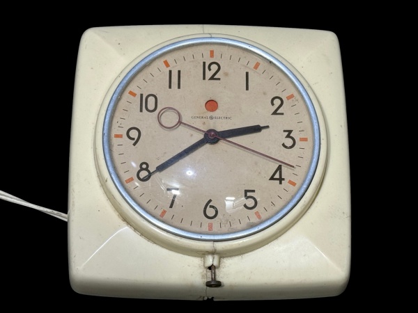 • RELÓGIO, um (1) relógio de parede elétrico da manufatura GENERAL ELETRIC, caixa em plástico na tonalidade branca apresentando rachaduras, mostrador com algarismos arábicos, visor em acrílico convexo, não funciona, necessita reparo, medindo 18,5x18,5cm.