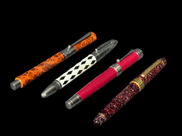 • CANETAS, quatro (4) canetas tinteiros de modelos, tamanhos e decorações distintas, todas com revestimento sintético de tonalidades distintas, novas, sem carga.
