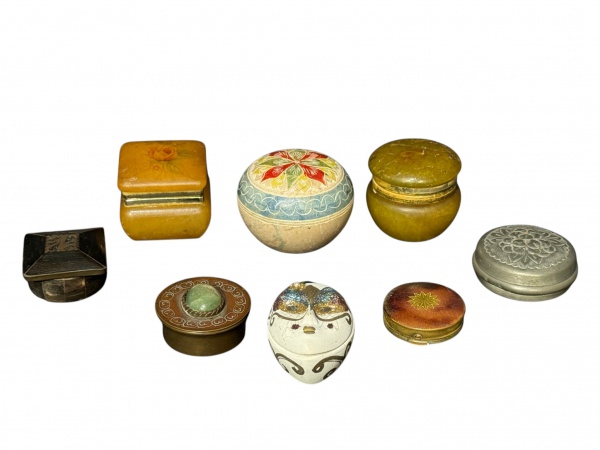 • DIVERSOS, oito (8) caixinhas de modelos, tamanhos, decorações e materiais distintos, sendo 2 em resina, 1 em pedra sabão, 1 estuque, 1 em estanho, 1 em metal cobreado, 1 em placas de chifre polido e 1 em metal dourado, maior medindo 5x5cm e menor 4cm.