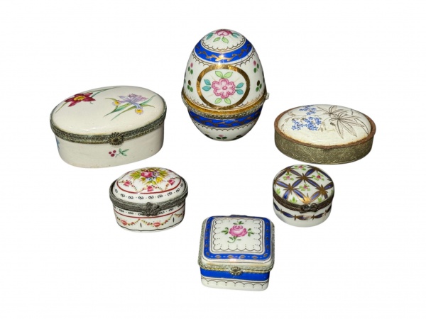 • PORCELANAS, seis (6) caixinhas confeccionadas em porcelana na tonalidade branca de modelos, tamanhos e decorações distintas, maior medindo 7,5x5,5cm (borda colada) e menor 2,5x3,5cm. 1 apresenta sinais de oxidação.