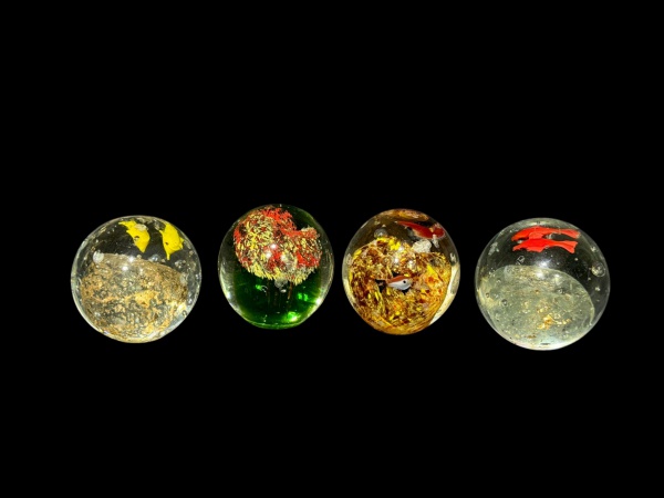 • MURANOS, quatro (4) pesos de papel confeccionados em vidro de Murano de decorações distintas, todos apresentam batidas, medindo 6x5,5cm.
