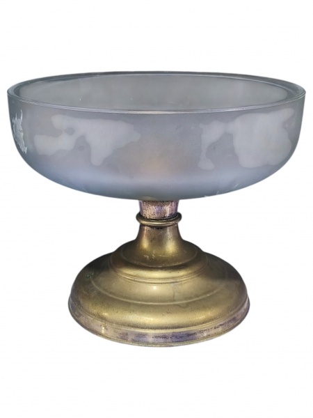 • CRISTAL, uma (1) fruteira confeccionada em cristal fosco com lapidação de palmas, esferas e frisos em baixo relevo, base cônica em metal espessurado a prata, apresentando falhas na prateação, medindo 18x22cm.