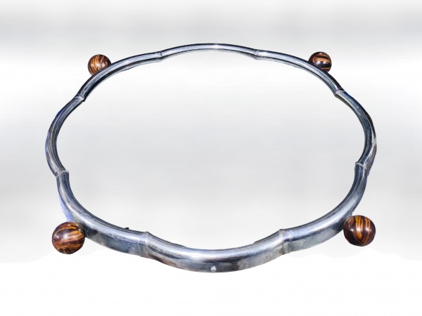 • DIVERSOS, uma (1) bandeja giratória com estrutura em madeira, fundo espelhado e moldura em metal cromado decorado por esferas em madeira, apresenta leves sinais de oxidação, medindo 6,5x46,5cm.