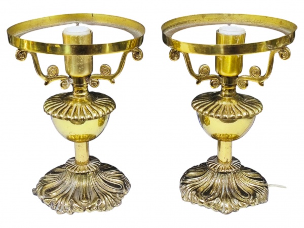 • ABAJURES, par (2) de abajures para uma lâmpada confeccionados em bronze com cinzelado de caneluras, corpo bojudo, haste cilindrica e base em elementos vegetalistas, aro redondo em metal dourado apresentando leves mossas, medindo 15x11cm.