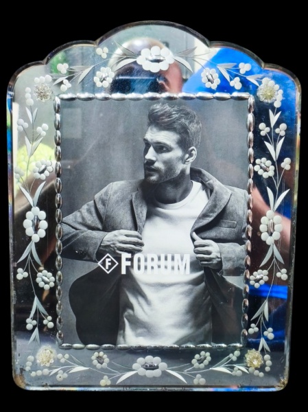 • CRISTAL VENEZIANO, um (1) porta retrato confeccionado em cristal veneziano espelhado com lapidação de guirlanda floral, parte superior em recortes, apresenta leves sinais de oxidação e bicado na ponta, vide foto, medindo 33,5x26cm.