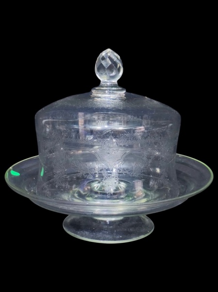 • Cristallerie Saint Louis (Saint-Louis-lès-Bitche, Lorraine, França, 1586), uma (1) tampa de queijeira confeccionada em cristal francês ricamente lapidada por guirlanda floral em baixo relevo, pega da tampa facetada e prato em vidro translucido com bicado na borda, medida total  21,5x12cm e tampa 16,5x17,5cm.