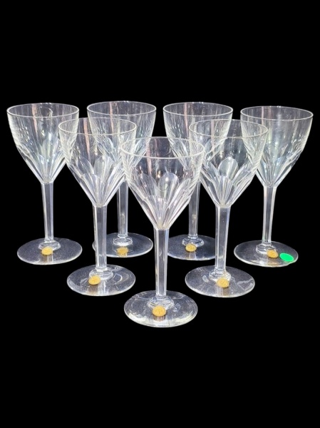 • BACARRAT (Fundada em 1764 na cidade de Baccarat, região da Lorena, França), sete (7) taças para vinho confeccionadas em cristal francês translucido com lapidação dita DEDÃO em baixo relevo, haste facetada, apoiada sobre base circular com selo da cristaleria, medindo 12,5x5,8cm. 1 bicada na base.