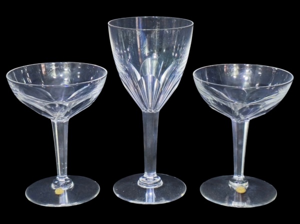 • BACARRAT (Fundada em 1764 na cidade de Baccarat, região da Lorena, França), três (3) taças, sendo: 2 para champanhe e 1 para água confeccionadas em cristal francês translucido com lapidação dita DEDÃO em baixo relevo, haste facetada, apoiada sobre base circular com selo da cristaleria, medindo 13x10cm e 18,5x8,5cm.