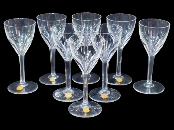 • BACARRAT (Fundada em 1764 na cidade de Baccarat, região da Lorena, França), oito (8) taças para vinho confeccionadas em cristal francês translucido com lapidação dita DEDÃO em baixo relevo, haste facetada, apoiada sobre base circular com selo da cristaleria, medindo 10,5x4,5cm.