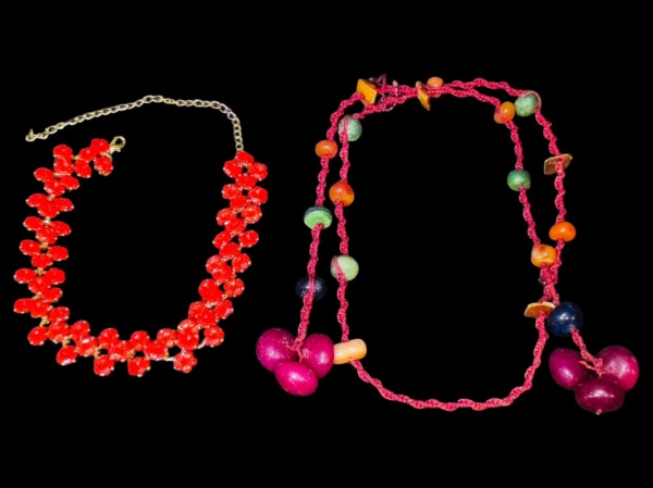 • BIJUTERIAS, lote com dois (2) colares, sendo: A) 1 em metal dourado com incrustações de flores em resina na tonalidade vermelha com pó dourado, fecho lobster, apresenta leves sinais de uso, medindo 49 cm de comprimento e B) 1 em tecido na tonalidade vinho com contas em pedras brasileiras, medindo 102cm de comprimento, sinais de poido.