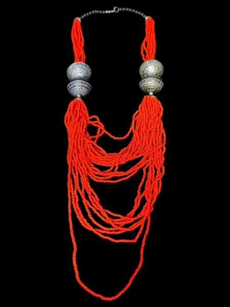 • BIJUTERIA, um (1) colar confeccionado com contas em missangas na tonalidade vermelha, esferas metálicas com cinzelado geométrico apresentando falhas na prateação, fecho lobster em metal prateado, apresenta sinais de uso, medindo 57cm de comprimento.