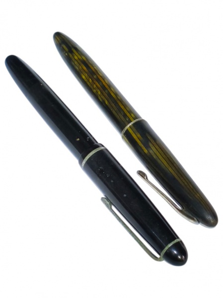 • CANETAS, lote com duas (2) canetas tinteiros, sendo: A) 1 SHEAFFERS, corpo em galalite nas tonalidades amarela e preta, bico apresentando mossa, quebra na tampa e falhas na douração do grampo e B) 1 da COMPACTOR, corpo em plástico na tonalidade preta e guarnições em metal prateado com sinais de oxidação, ambas vendidas no estado.
