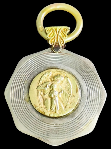 • ARTE SACRA, uma (1) medalha de berço confccionada em metal espessurado a prata e dourado representando Anjo da Guarda, argola superior com marcação AE, possivelmente Abrahmo Eberle, medindo 8,5x5,5cm.