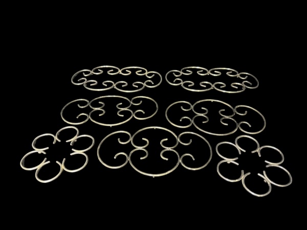 • METAL PRATEADO, sete (7) descansos para pirex confeccionados em metal espessurado a prata com vazados em volutas de dois modelos distintos, maior medindo 34,5x18cm e menor 16cm.