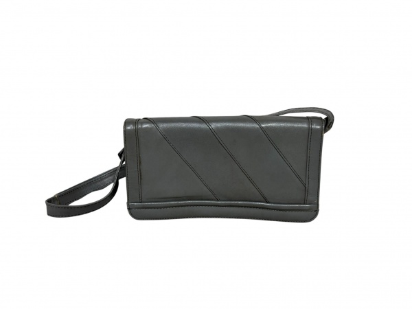 • <B>ACESSÓRIO FEMININO</b>, uma (1) bolsa clutch confeccionada em couro na tonalidade cinza, parte frontal com faixas torcidas, 4 divisórias internas, ferragens em metal dourado com sinais de oxidação e leves falhas no couro, medindo 15x27cm.
