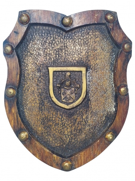 • <b>DIVERSOS</b>, uma (1) placa decorativa em formato de escudo, confeccionada em resina patinada com laterais em recortes e aplicação de rebites em metal dourado, pintados em tom dourado envelhecido. Parte central com textura martelada e acabamento em pátina dourada, trazendo pequeno brasão estilizado ao centro, com elmo e campo escudo em relevo. Peça de inspiração medieval, medindo 25,5x20,5cm.