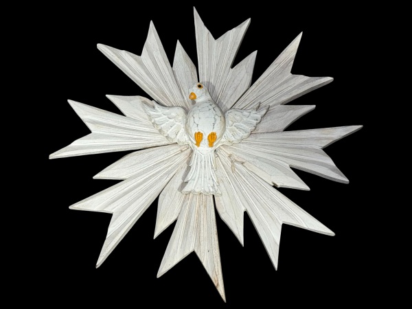 • ARTE SACRA, um (1) Divino Espirito Santos confeccionado em madeira patinada na tonalidade branca, entalhes de repuxados com recortes na borda, Pomba ao centro em relevo, medindo 26cm de diâmetro.