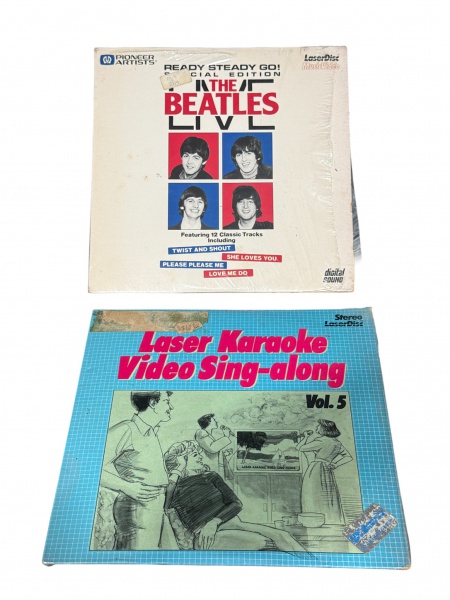 • DISCOS DE VINIL, dois (2) discos LaserDisc, sendo: A) The Beatles Live  Ready Steady Go!  edição especial em LaserDisc (Music Video), apresentando performance histórica do grupo The Beatles, com 12 faixas clássicas, incluindo Twist and Shout, She Loves You, Please Please Me e Love Me Do. Publicação da Pioneer Artists, com indicação de digital sound. Capa com sinais de manuseio e desgaste do tempo, conforme imagens e B) Laser Karaoke  Video Sing-Along, Vol. 5  LaserDisc estéreo, dedicado a sessões de karaokê/vídeo sing-along, com capa ilustrada em estilo gráfico da época. Apresenta desgastes, marcas e sinais de uso, compatíveis com a idade do item.