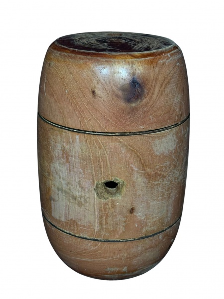 • DIVERSOS, um (1) tonel/barril confeccionado em madeira clara torneada, corpo liso, decorado por faixas horizontais em baixo relevo, furo na parte superior e na parte lateral, medindo 25x14cm.