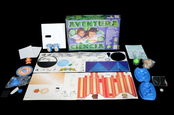 • COLECIONISMO, um (1) jogo educativo Aventura da Ciência, conjunto didático infantil voltado ao aprendizado lúdico de princípios científicos, com diversos componentes originais, incluindo tabuleiros ilustrados, cartelas, moldes plásticos, copos, frascos, discos, acessórios e manual, caixa com marcas do tempo, vendido no estado da foto.