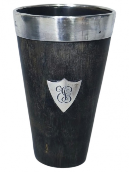 • PRATA DE LEI, um (1) copo confeccionado em chifre polido, guarnições em prata inglesa da manufatura MAPPIN & WEBB, frente com escudo monogramado, apresenta quebra no fundo, medindo 12x7,5cm.