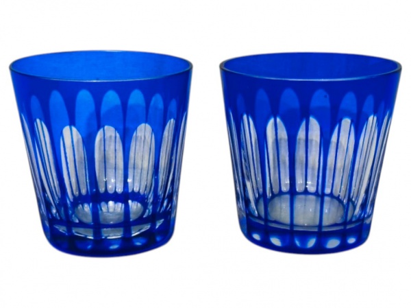 • CRISTAL DOUBLE, par (2) de copos para whisky confeccionados em cristal double na tonalidade azul com lapidação de caneluras translucidas, medindo 8x8cm.