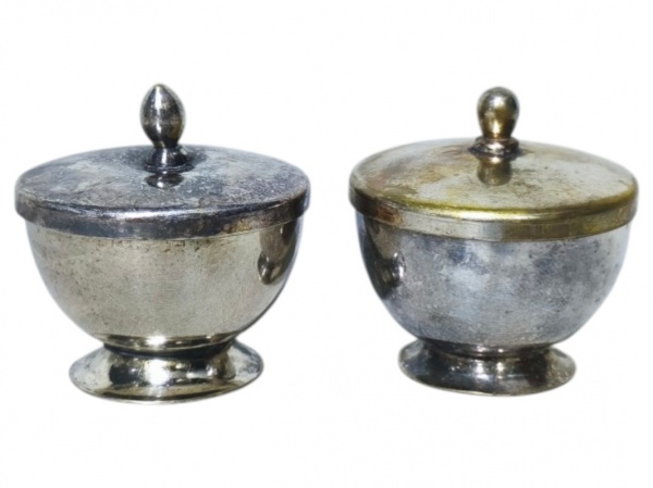 • METAL PRATEADO, dois (2) pequenos recipientes com tampa confeccionados em metal espessurado a prata, 1 deles apresenta falhas na prateação, medindo 4x4cm.