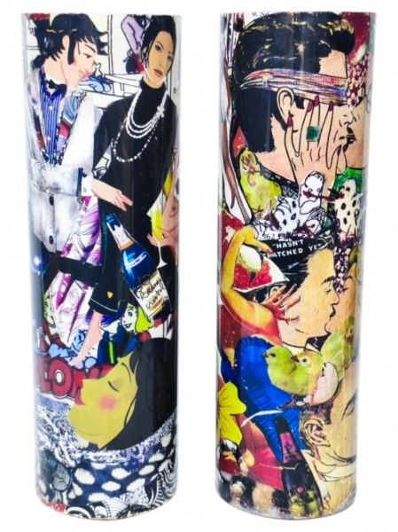 • LUMINÁRIAS, duas (2) luminárias de mesa dos anos 70 para uma lâmpada confeccionado em acrílico estampados com ilustrações em estilo pop art/colagem, 1 com pé quebrado e ambos necessitam nova fiação, medindo 45,5x14cm.