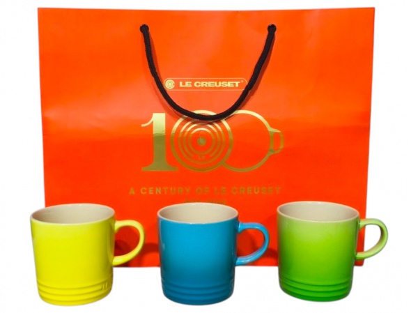 • Le Creuset, Fresnoy-le-Grand, França (Fundada em 1925), três (3) canecas confeccionadas em cerâmica francesa refratária esmaltada nas tonalidades amarela, azul e verde, com capacidade de 350ml, medindo 9,5x12x9cm.