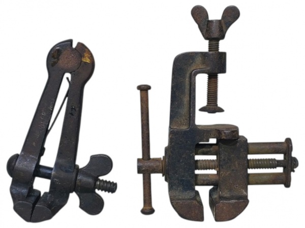 • FERRAMENTAS, lote com duas (2) morsas, sendo 1 de mão e 1 de bancada, confeccionadas em ferro fundido, medindo 16,5cm e 14cm.