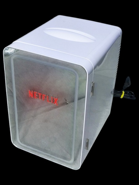 • ELETRÔNICO, um (1) refrigerador de cosméticos da manufautra MULTILASER, frente espelhada com colagem NETFLIX, ligando, porém, sem garantias futuras, medindo 29,5x26x20cm.