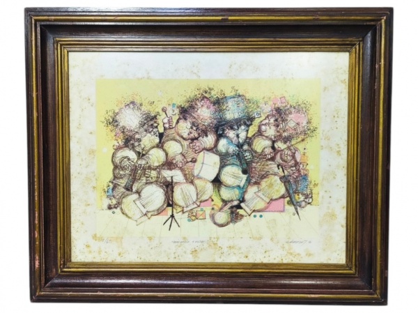 • Alexandre Rapoport (muitas vezes citado só como Rapoport) foi pintor, arquiteto, desenhista e gravador brasileiro, nascido no Rio de Janeiro em 1929, "Homenagem a Mozart", serigrafia assinada e datada 1991, tiragem 18/65, moldura em madeira medindo 57,5x70,5cm e obra 31x43,5cm. Sinais de fungos.