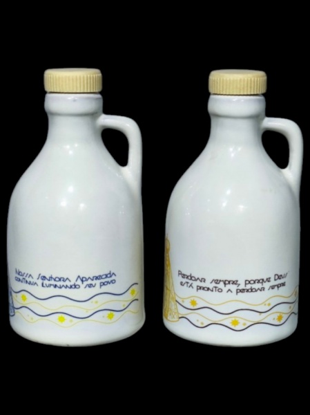 • ARTE SACRA, lote com dois (2) porta água benta confeccionados em porcelana na tonalidade branca, decorado por imagens de Nossa Senhora de Aparecida e do santuário de Aparecida do Norte, peças novas, medindo 13,5cm.