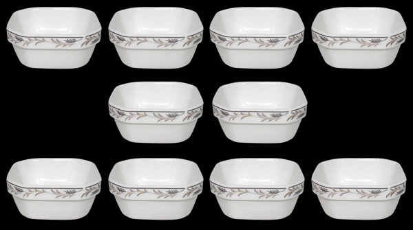 • <b>NORITAKE & VARIG</b>, dez (10) recipientes para sobremesa confeccionados em porcelana esmaltada na tonalidade branca, formato oitavado, bordas decoradas por guirlanda de folhagens e filetes em prata, alguns apresentando pequenas falhas na prateação, medindo 3x9x9cm.