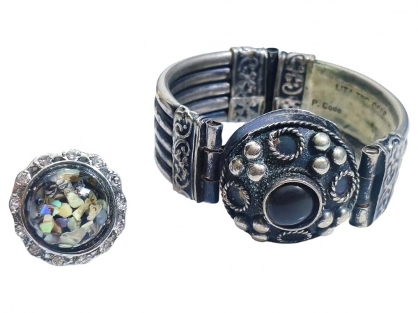 • BIJUTERIAS, lote com duas (2) peças, sendo: A) 1 bracelete ao gosto indiano confeccionado em metal espessurado a prata decorado por fios torcidos e perolados em relevo, pulseira em caneluras, medindo 6,5x7cm e B) 1 anel confeccionado em metal espessurado a prata com incrustação de pedrarias sintéticas e esfera com madre pérolas na parte interna, aro 21.