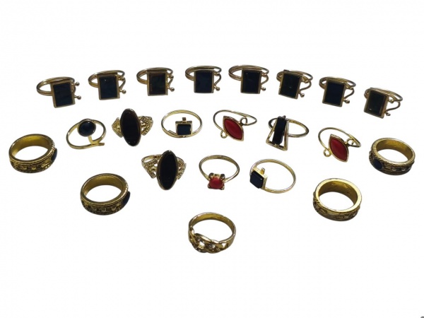 • BIJUTERIAS, lote com vinte e dois (22) anéis confeccionados em metal dourado de modelos, tamanhos e decorações distintas.