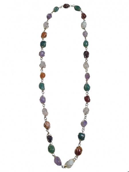 • BIJUTERIA, um (1) colar com armação em metal dourado e contas em pedrarias brasileiras distintas, medindo 40cm de comprimento.