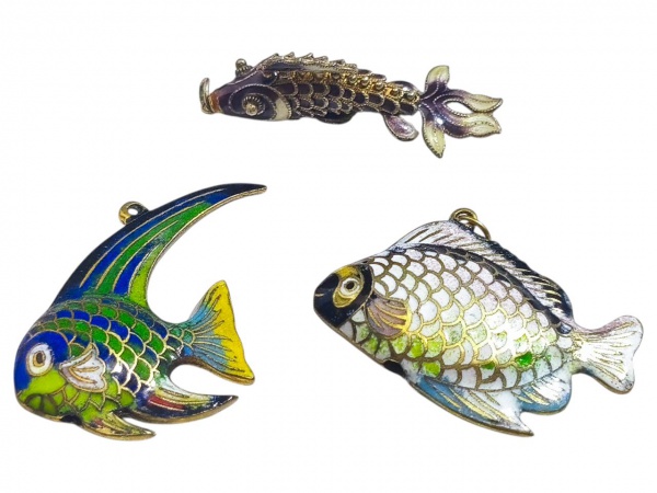 • BIJUTERIAS, lote três (3) pingentes confeccionados em CLOISONNÉ representando peixes de modelos e tamanhos distintos, sendo 1 articulável, maior medindo 4x3cm e menor 4x1cm.