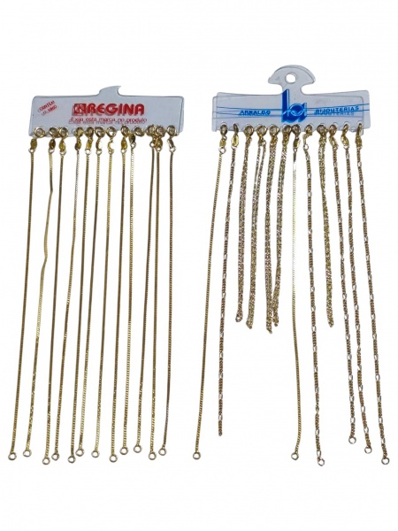 • BIJUTERIAS, seis (6) cordões confeccionados em metal dourado com pingentes de modelos, tamanhos e decorações distintas, 2 não possuem pingentes, medindo 42,5cm e 46,5cm e 50cm.