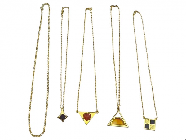 • BIJUTERIAS, cinco (5) cordões confeccionados em metal dourado com pingentes de modelos, tamanhos e decorações distintas, 1 não possui pingente, medindo 40cm e 49cm.