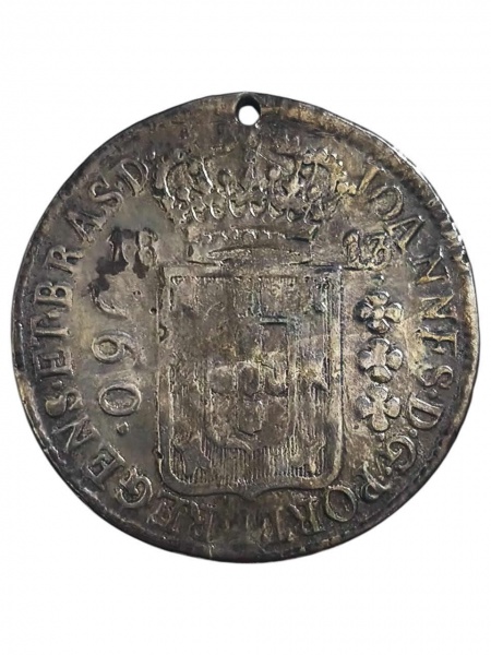 • NUMISMÁTICA, um (1) moeda de prata de 960 Réis de 1813 (popularmente conhecida como Patacão, cunhada em 1817 durante o período em que D. João VI era o Príncipe), letra monetária, possui furo na parte superior, possivelmente usada como pingente, medindo 4cm e pesa 21,7g.