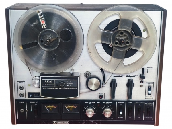 • SOM, um (1) gravador de rolo, marca Akai, modelo 4000DB, fabricado no Japão, em gabinete com laterais amadeiradas, painel frontal metálico, com dois carretéis, VU meters, sistema Dolby e comandos frontais de operação e gravação. Aparelho clássico de áudio, próprio para reprodução e gravação em fita magnética, de reconhecido interesse para colecionadores de eletrônicos vintage e apreciadores de equipamentos hi-fi. Indicação na plaqueta: AC 120V, 60Hz, 40W. No estado, sem testes, com sinais de uso e do tempo, sem garantia de funcionamento, medindo 32x41x14cm.