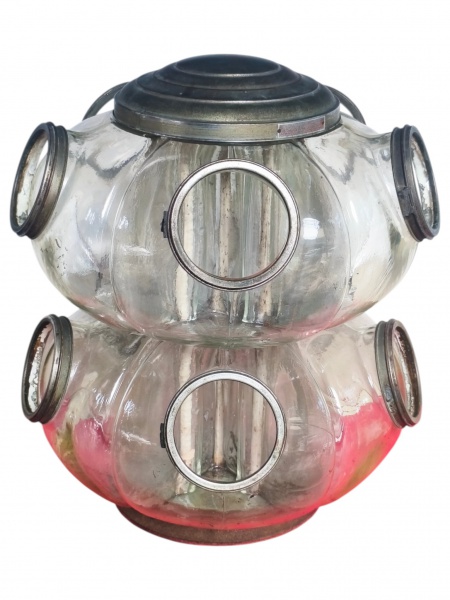 • VIDRO, um (1) grande baleiro de 10 gomos confeccionados em vidro translucido com estrutura metálica com sinais de oxidação e necessitando revisão, bordas em metal prateado com ausência das tampas, gomos em excelente estado, medindo 49x41cm.
