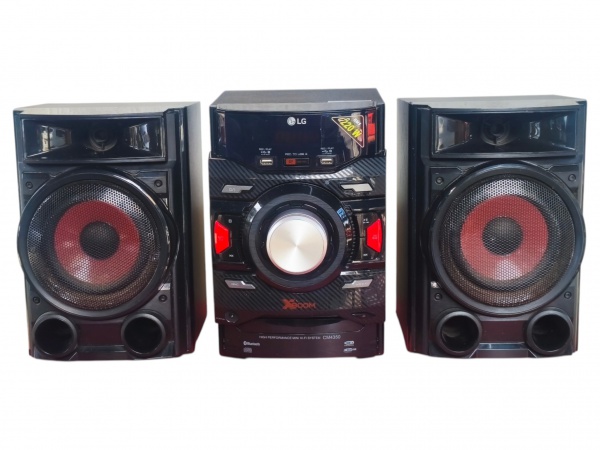 • SOM, um (1) aparelho de som mini system, marca LG, modelo CM4350, acompanhado de duas (2) caixas acústicas, com painel frontal em acabamento preto, detalhes em vermelho, entradas USB, conexão Bluetooth e indicação de potência 2200W no visor frontal, não testado e' sem garantia de funcionamento, medindo 30x20,5x21cm.