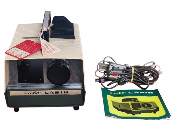 • ELETRÔNICO, um (1) antigo projetor de slide japonês da marca CABIN, modelo automático, em estado de novo com etiqueta original, acompanha manual e fonte, funcionando, porém, sem garantias futuras, medindo 14x17,5x27cm.
