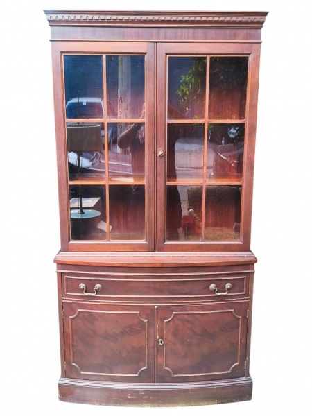 • MOBILIARIO, uma (1) cristaleira confeccionada em madeira escura, parte superior com duas portas envidraçadas e interior com 2 prateleiras, sobre base inferior com um gavetão e duas portas almofadadas, em bom estado de conservação, medindo 181x95x33,5cm.